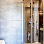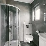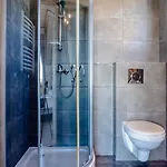 Die Villa Cichy Domek - Podgrzewany Basen, Sauna I Jacuzzi W Cenie Pobytu verfügt über einen Parkettboden sowie Parkettbodenbelag. Die Badezimmer in dieser Unterkunft sind mit einer begehbaren Dusche und einer getrennten Toilette ausgestattet.